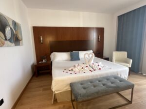 Equipamiento de la habitación: Cama de 2×2 metros, sala de estar y baño privado con bañera y ducha de hidromasaje, 2 terrazas,