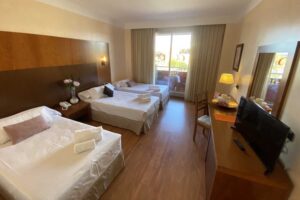 Habitación amplia con decoración vistosa, aire acondicionado, suelo de parqué, balcón, conexión Wi-Fi gratuita y TV vía satélite.